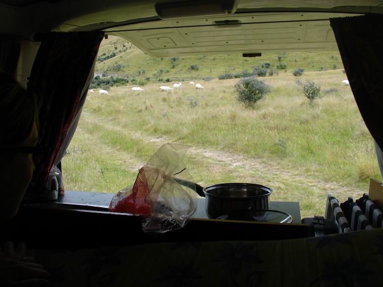 Description: Probuzeni u Qeenstownu. Cekali na nas vsudepritomne ovecky.